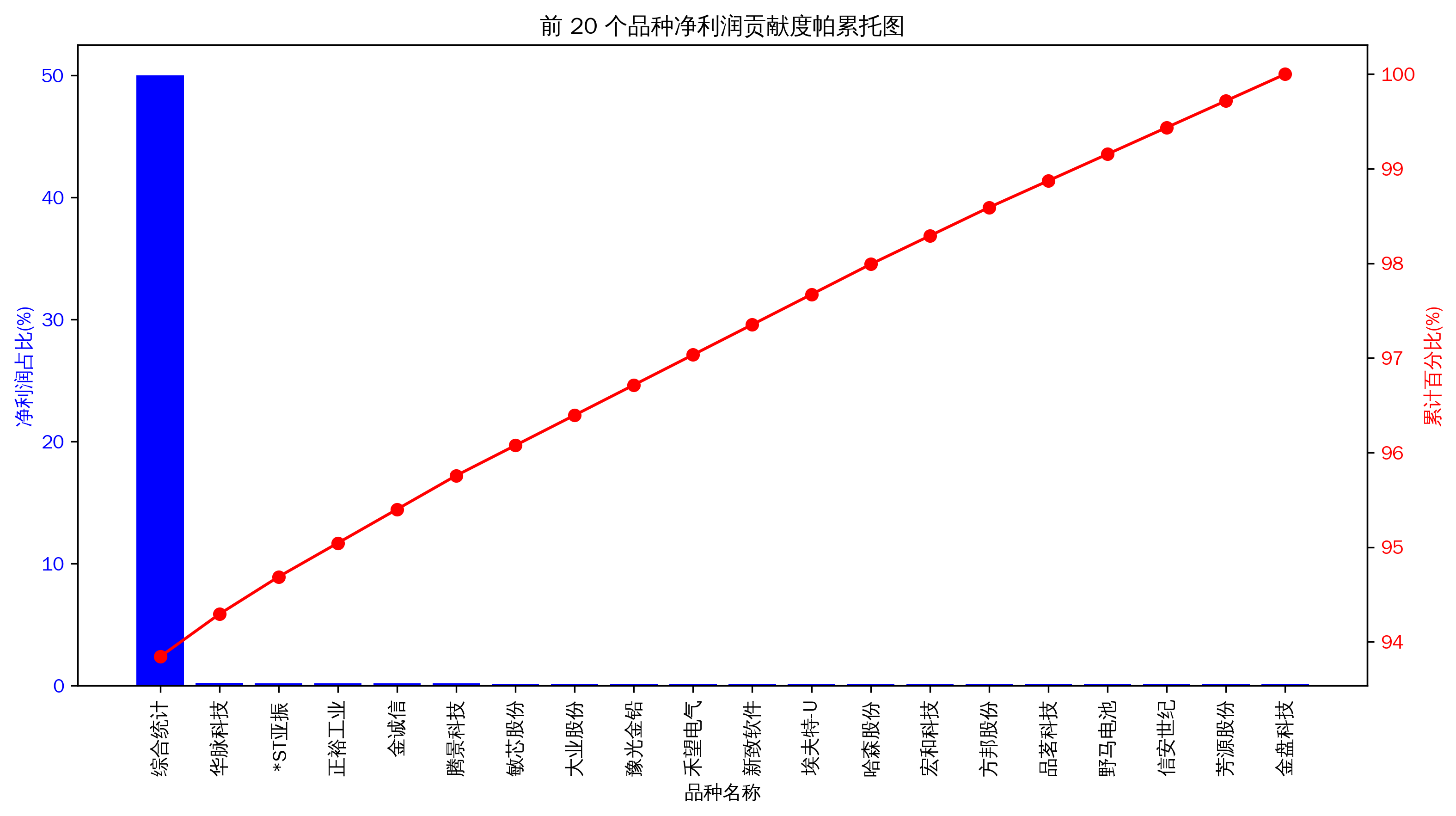 cumulative_percentage = top_20['净利润占比(%)'].cumsum() / top_20['净利润占比(%)'].sum() * 100