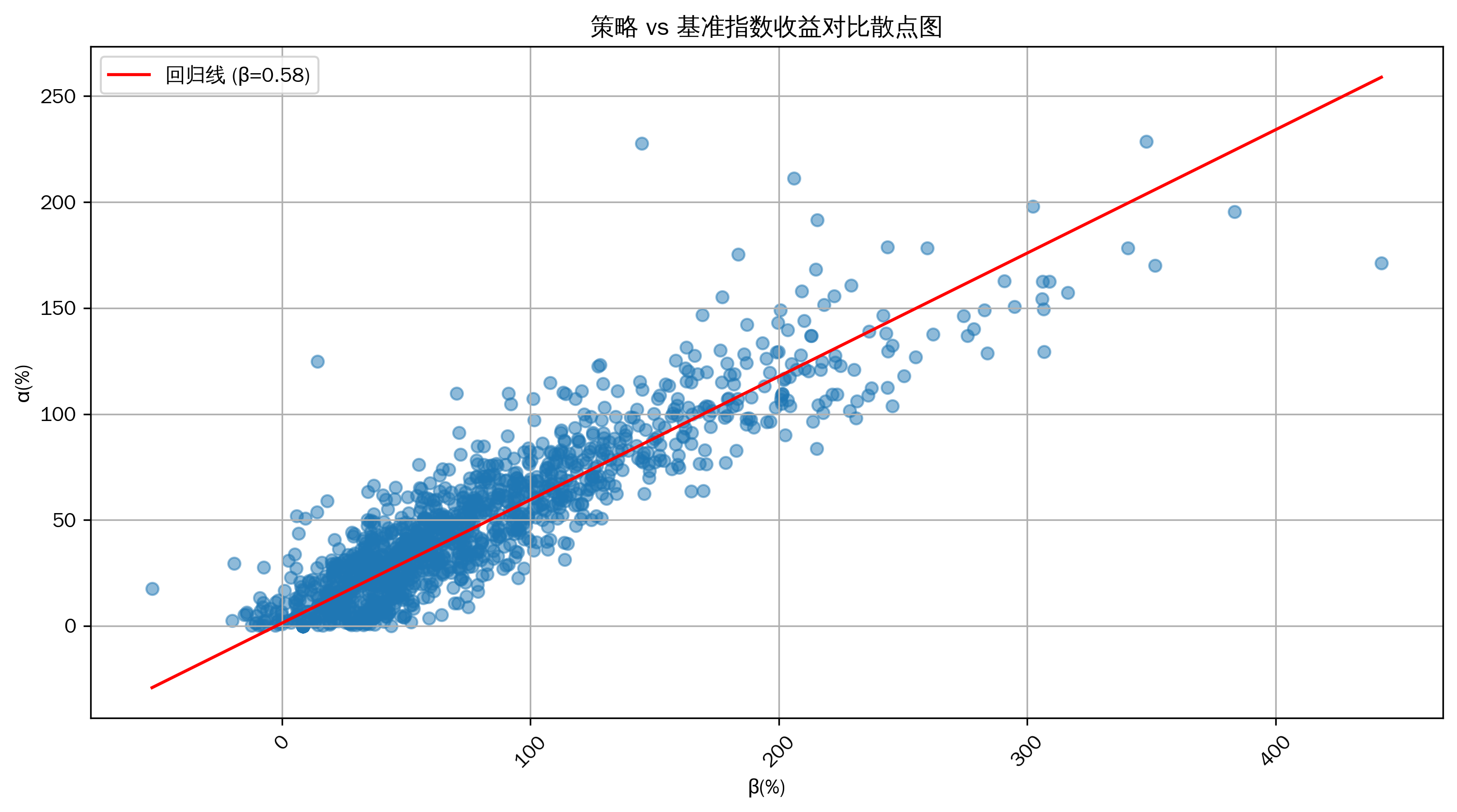 从散点图中可以直观地看到策略的α值(超额收益)与β值(系统性风险)之间的关系。图中的回归线斜率代表了β值,通过它可以进一步验证之前计算得到的β值,并且直观地展示策略收益与市场收益的相关性。如果散点较为集中地分布在回归线附近,说明α和β之间的线性关系较强;如果较为分散,则表示可能存在其他因素对策略的超额收益产生影响。