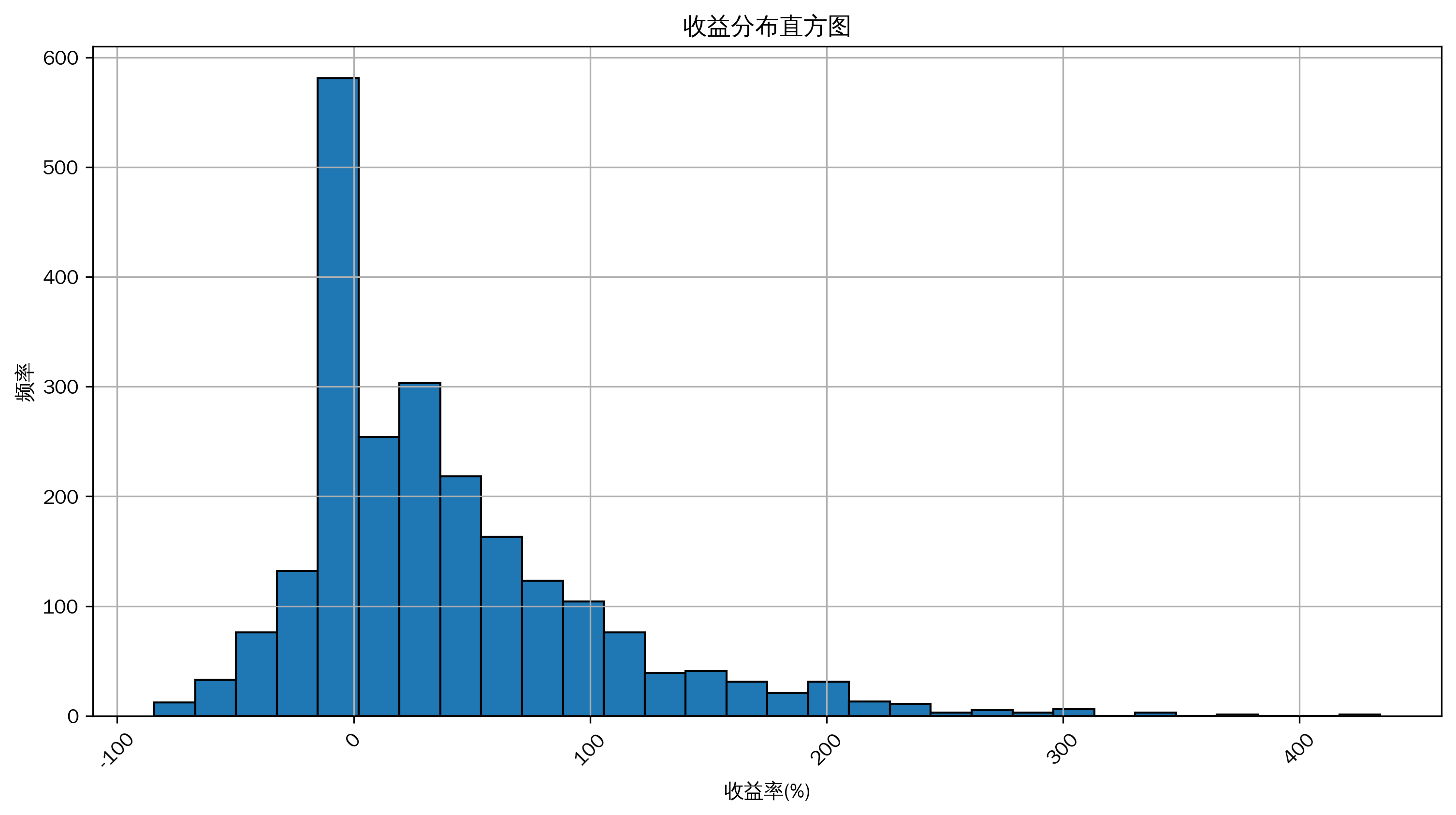 从直方图中可以直观看到收益率的分布频率情况,从而进一步分析收益分布是否正态,以及盈利和亏损的分布特征。
