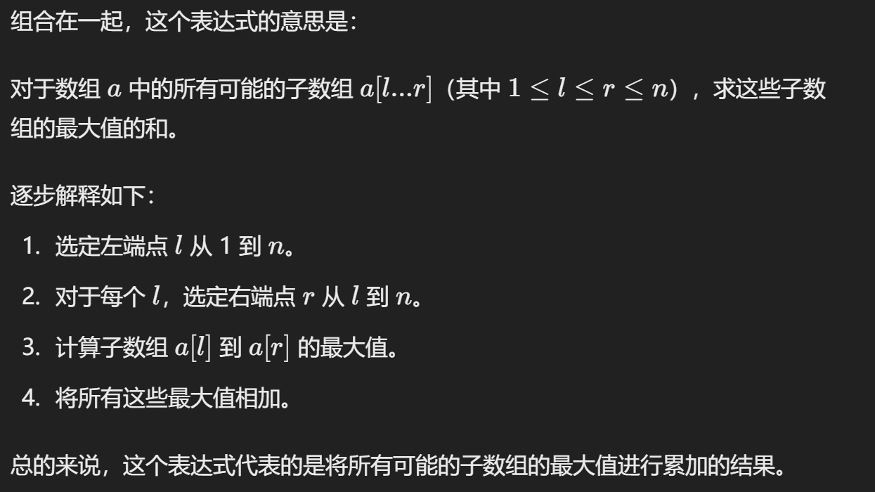参加比赛的共有 n 名选手。 名选手排成一行,从左到右第 i 位选手的实力用正整数 a[i] 表示。如果两名实力分别为 x,y 的选手单挑,则获胜的概率分别为 x/(x+y), y/(x+y)。